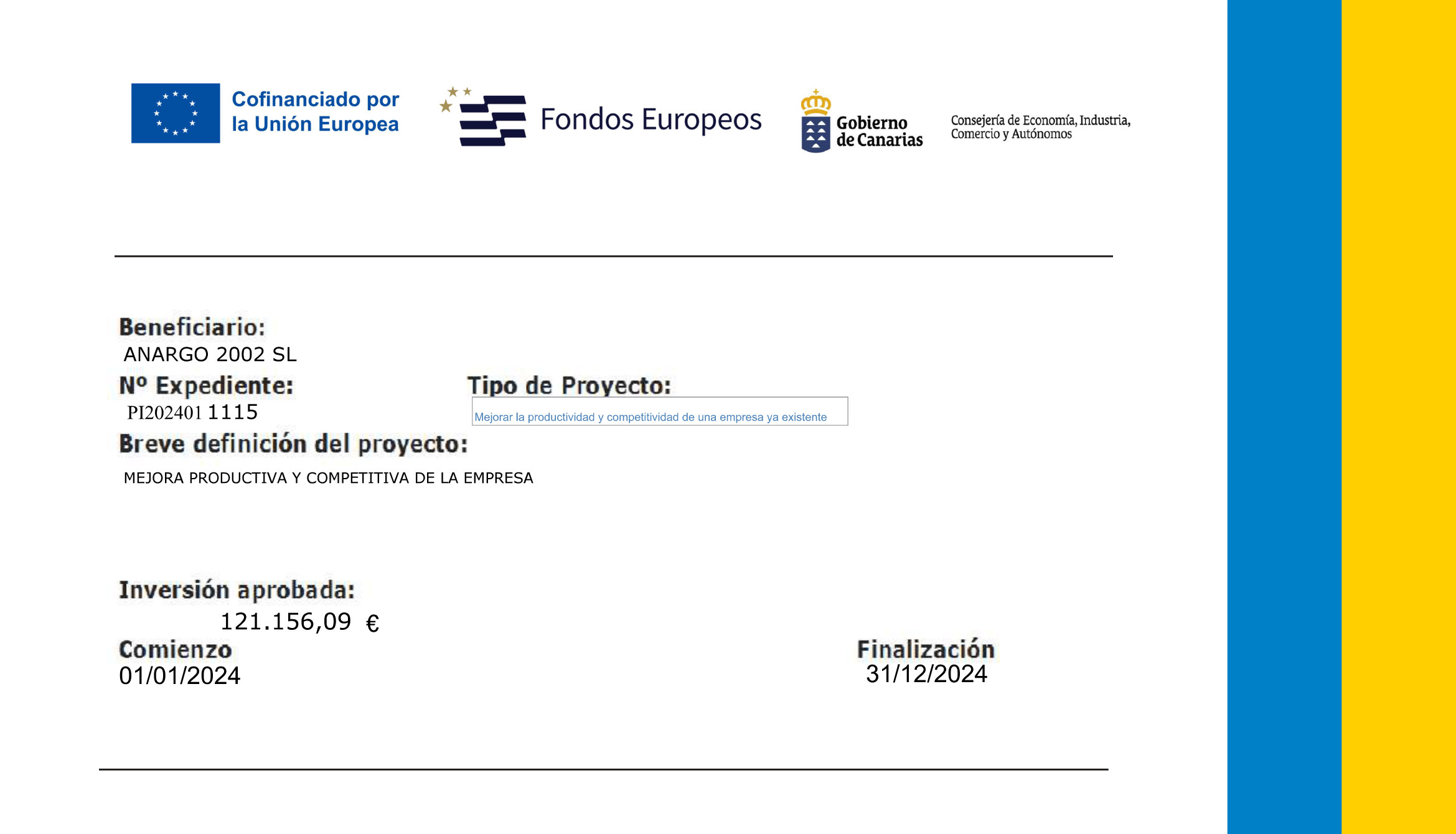 Proyecto financiado por la Consejería de Economía, Industria, Comercio y Autónomos, gracias a los Fondos Europeos. Proyecto financiado: Mejorar la productividad y competitividad de una empresa ya existente